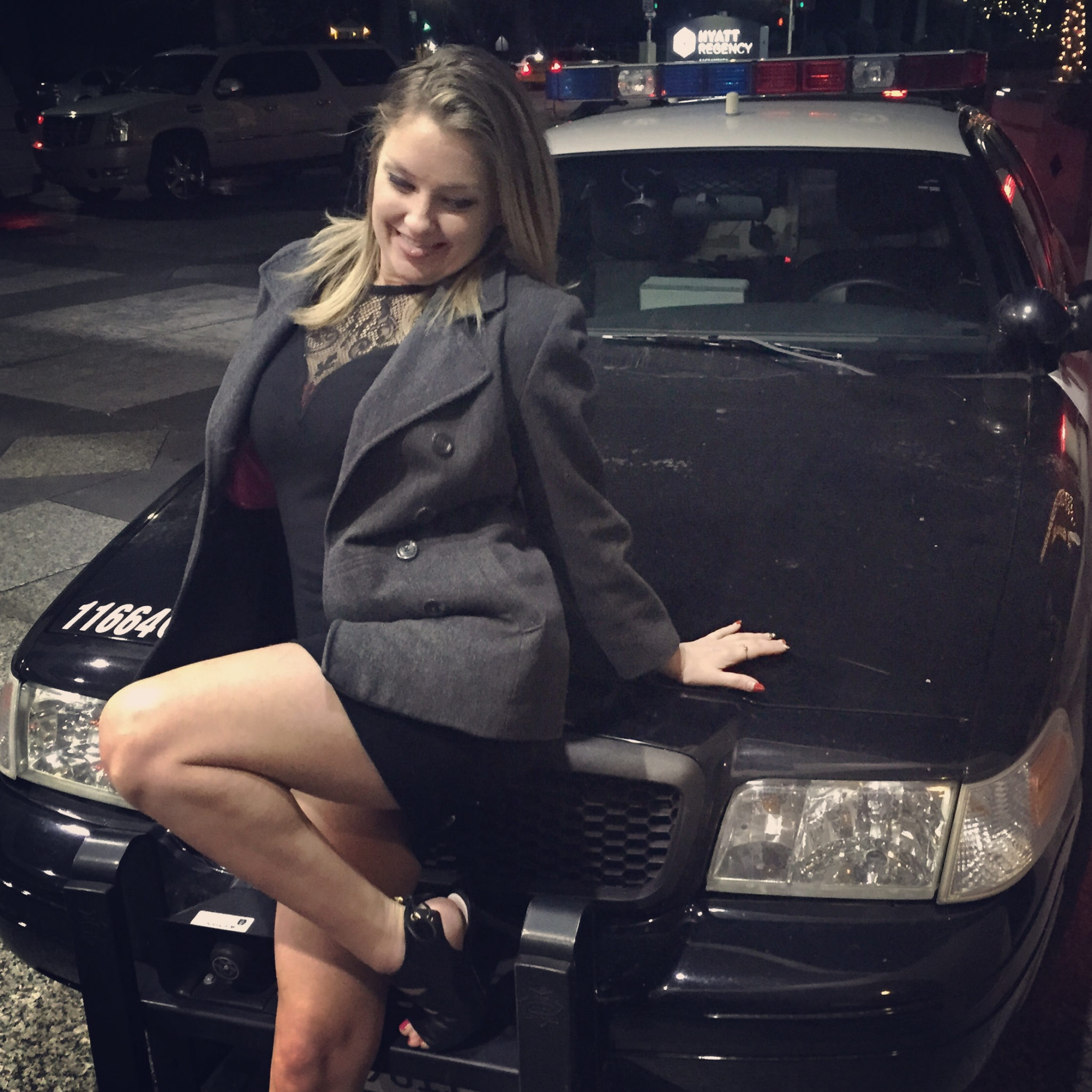 So my girlfriend and I walk outside of the hotel party – we had enjoyed such a fabulous night and I was literally feeling ON TOP OF THE WORLD. Literally. On. Top. Of. The. World. So in that moment, I saw this beautiful cop car and I thought – OMG this would make such a great photo opportunity. So yes. Now, while I don’t think I would have been arrested if the police had actually walked out.